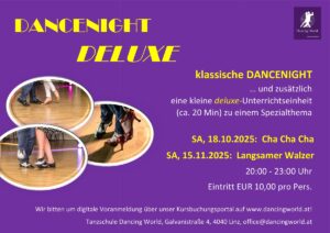 Unser beliebtes Format darf in der neuen Kurs-Saison selbstverständlich nicht fehlen! Für alle unsere Tanzfreunde gibt’s wieder tanzen, üben und Neues lernen in einem. Im Rahmen der Dancenight Deluxe. Freut…