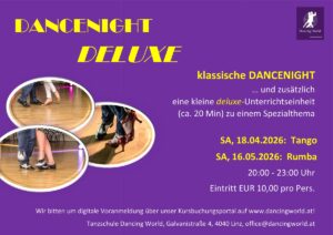 in der Tanzschule Dancing World in Linz: Für alle Tanzbegeisterten gibt’s wieder Tanzen, Üben und Neues lernen in einem. Im Rahmen der Dancenight Deluxe. Freut