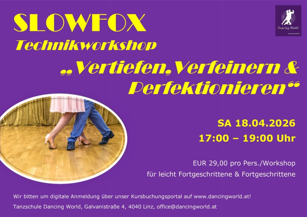 in der Tanzschule Dancing World Der Samstagnachmittag steht ganz im Zeichen von Slowfox Technik.Macht mit beim Workshop, und versteht die außergewöhnliche Bewegung des Slowfox, macht